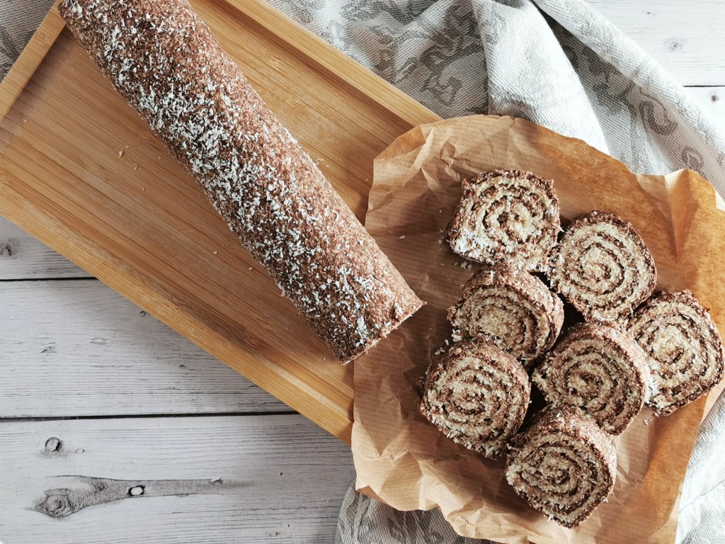 - Óvatosan sodorjuk át és a hosszabbik oldala mentén tekerjük szorosan fel, majd forgassuk kókuszreszelékbe.