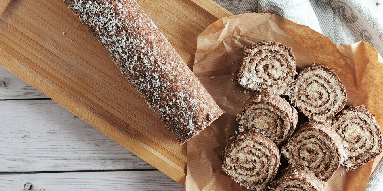 - Óvatosan sodorjuk át és a hosszabbik oldala mentén tekerjük szorosan fel, majd forgassuk kókuszreszelékbe.
