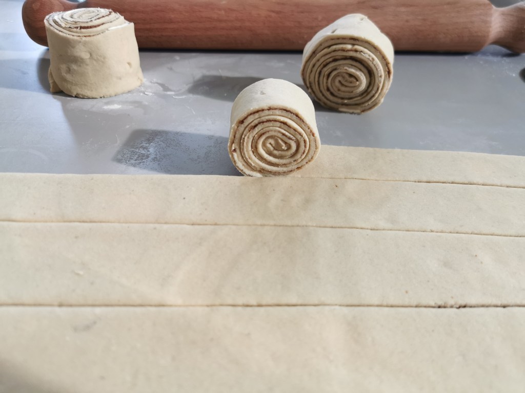 - A hosszabbik oldala mentén pizzavágóval vágjunk 1,5 ujjnyi vastag csíkokat és tekerjük fel ezeket.
