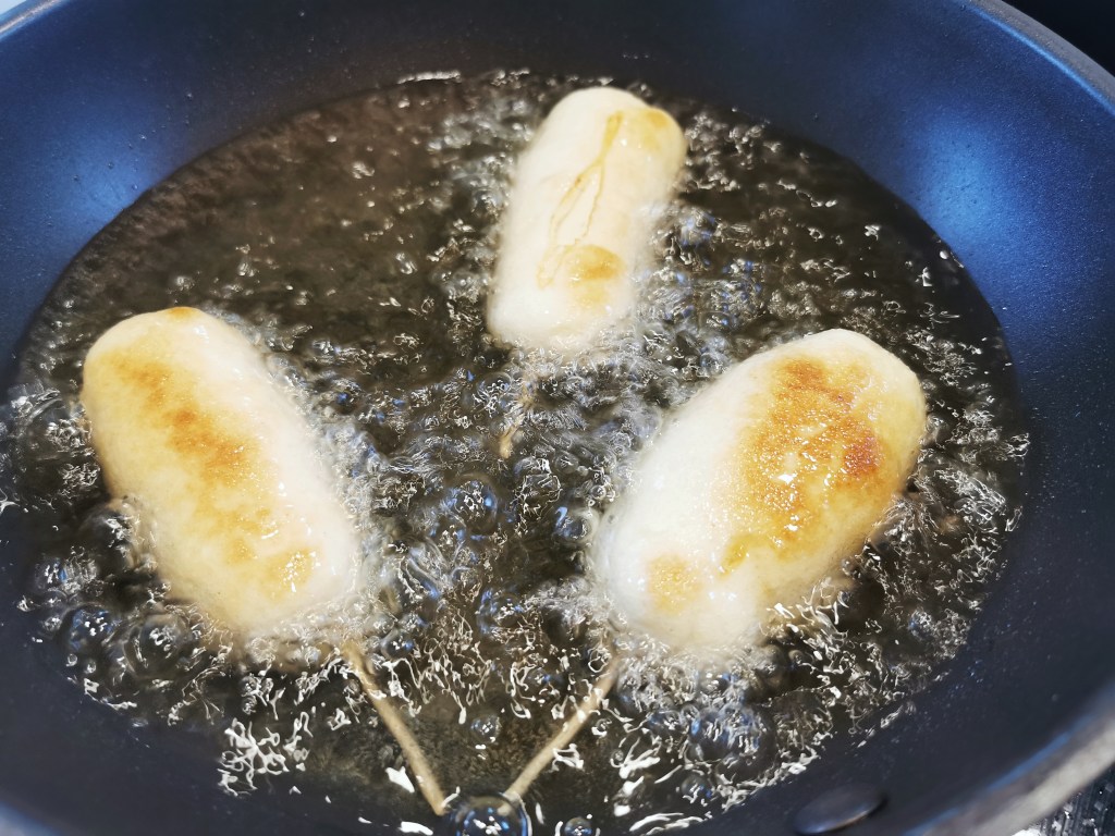 - Egy serpenyőben forrósítsunk fel olajat és süssük aranybarnára a lángos rudakat.