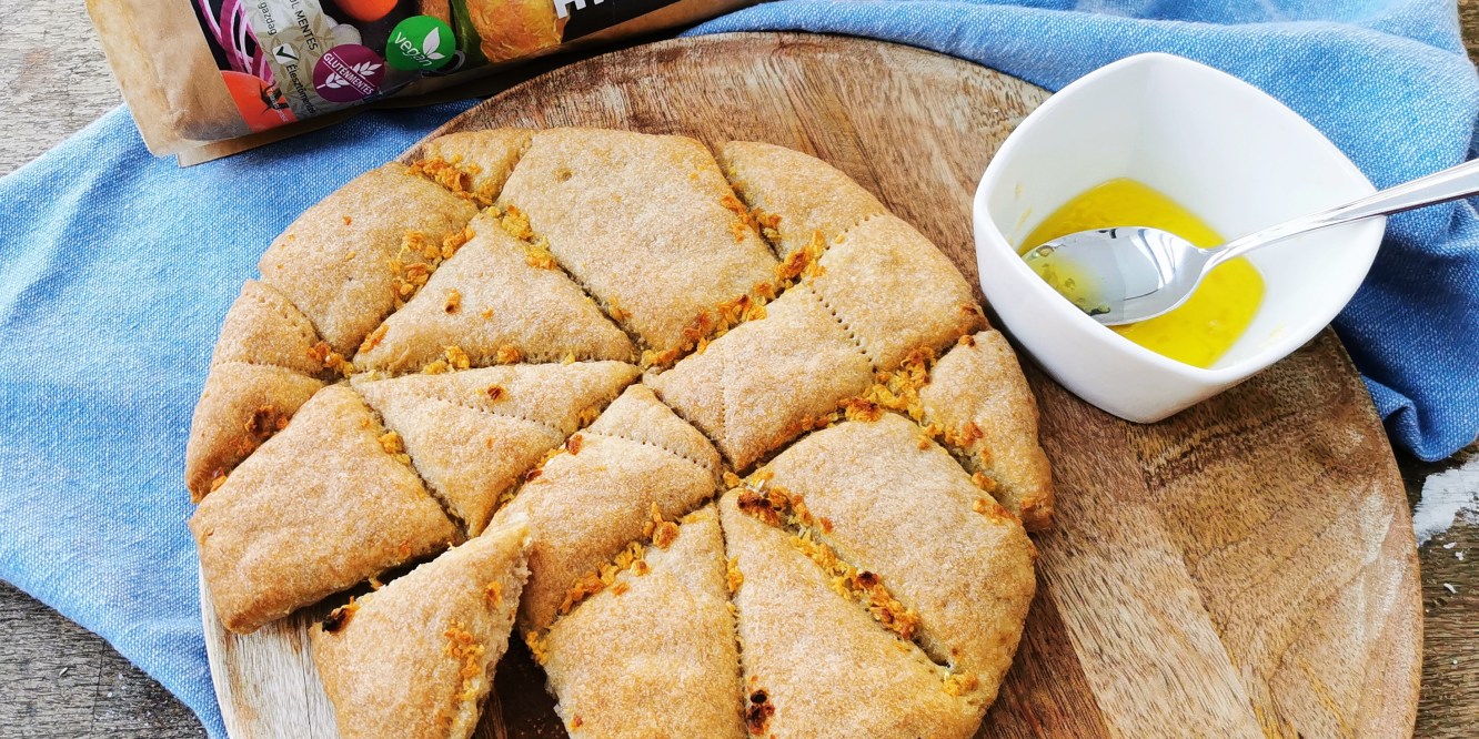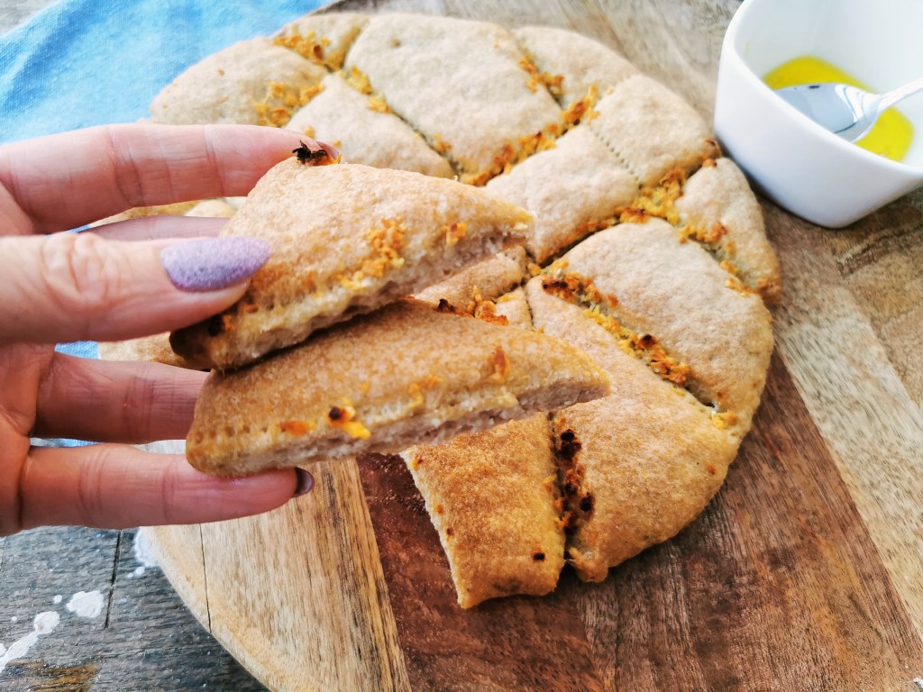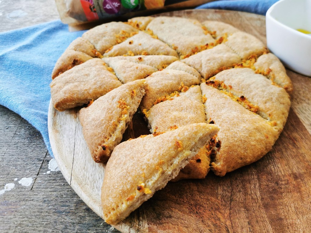 A begyúrt tésztát nyújtás után random vagdostam be derelye vágóval, majd a bemetszésekbe folyattam fokhagymás olívaolajat és így sütöttem meg. Így sütés után nem kell késsel szeletelni, nyugodtan tépkedhetjük a darabkákat. Szerintem tök menő vendégváró falatkáknak is.