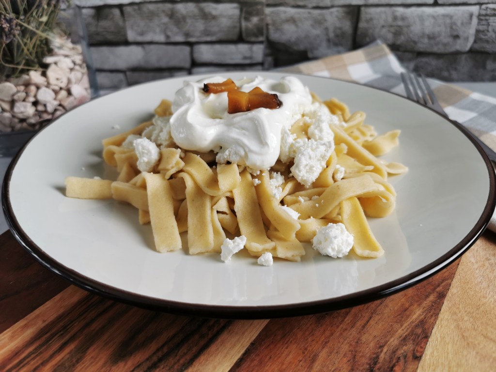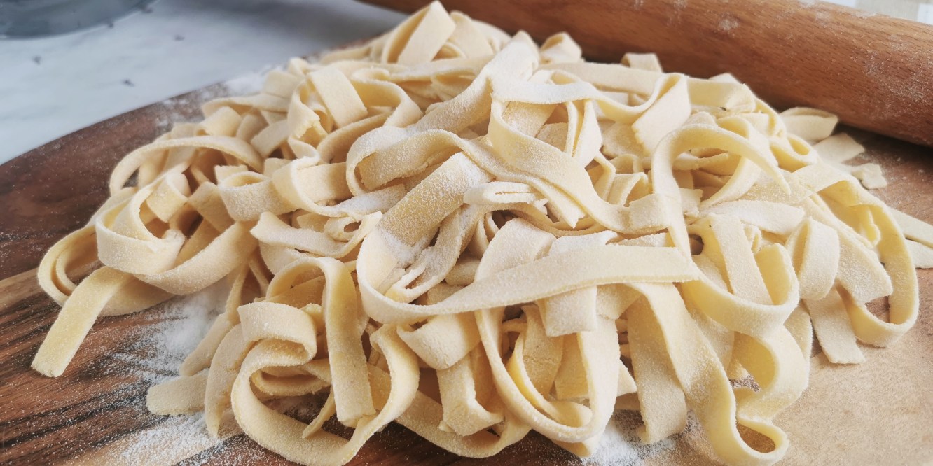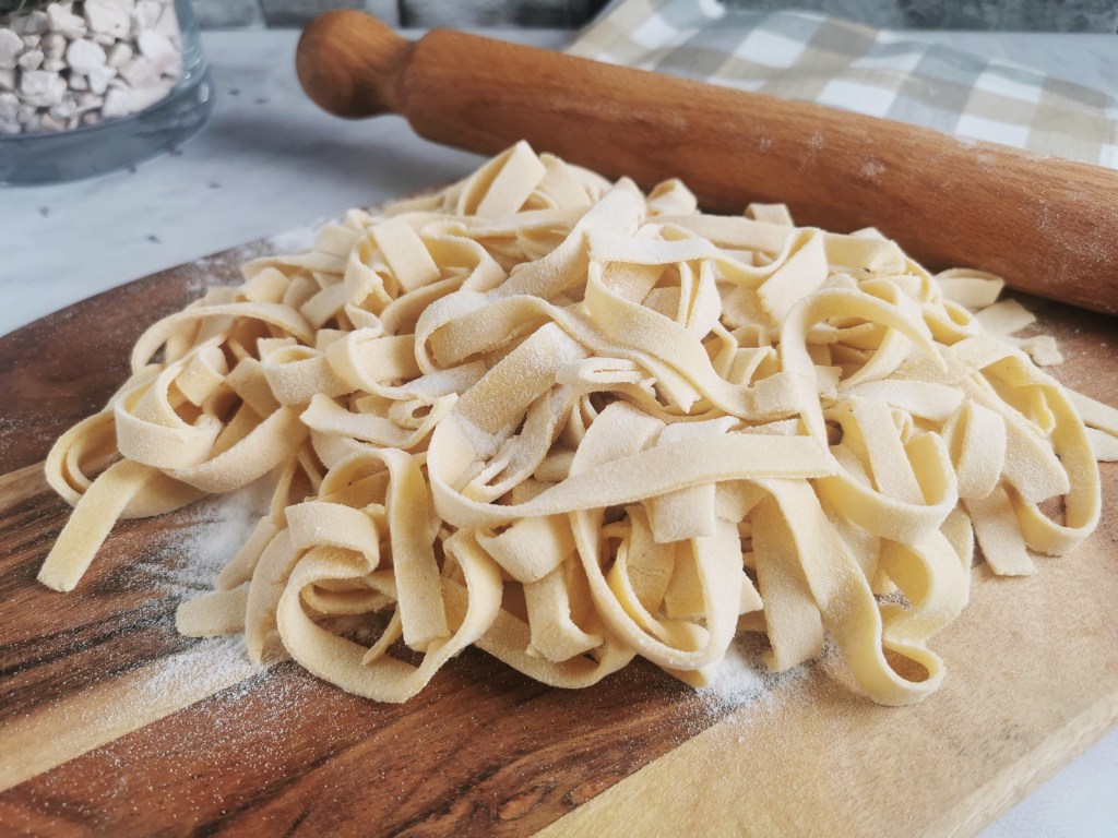 A házi, gyúrt tészta alapja liszt, tojás és egy kevés só. Az alakja tetszőleges, amit éppen az általunk megálmodott étel megkíván. Ez a tészta kézzel készült, sodrófával sodort, késsel vágott és épp szélesmetélt alakú.
