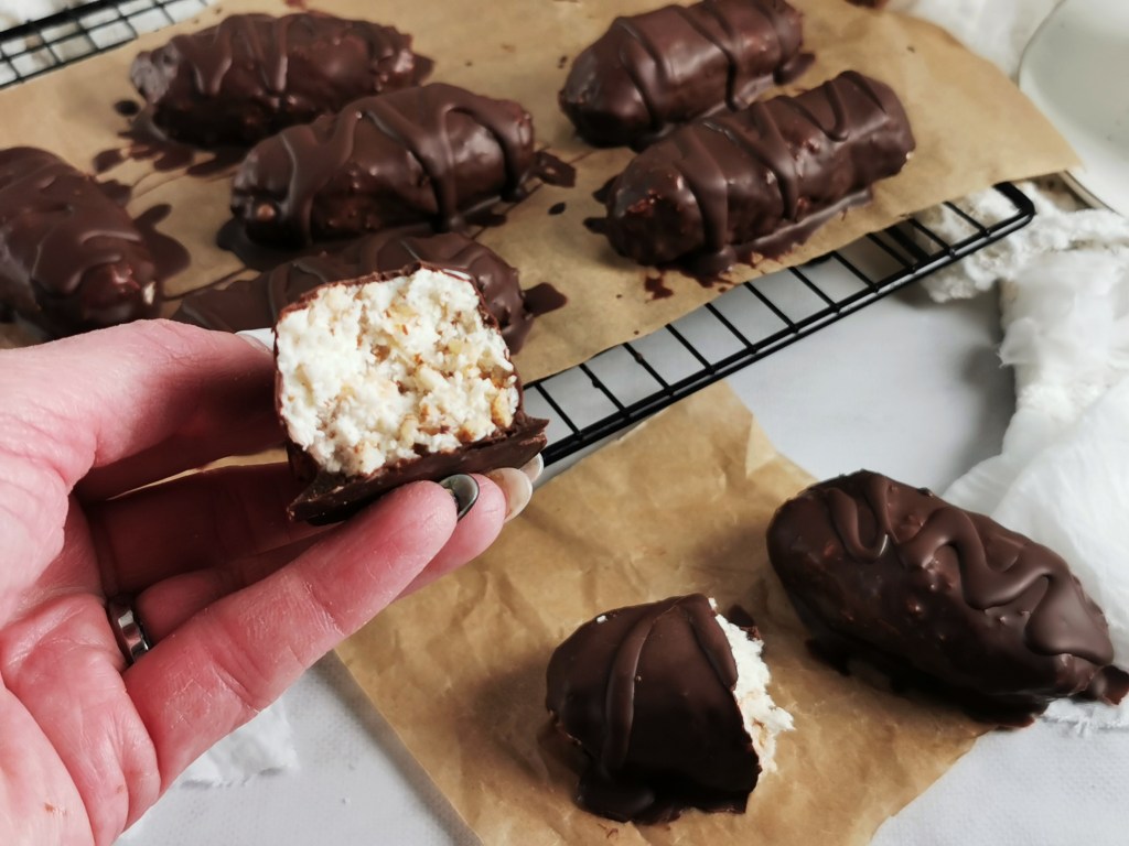 - A csokoládét olvasszuk fel, keverjük hozzá a kókuszolajat és forgassuk bele a kókuszos szeleteket.