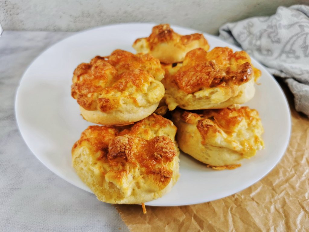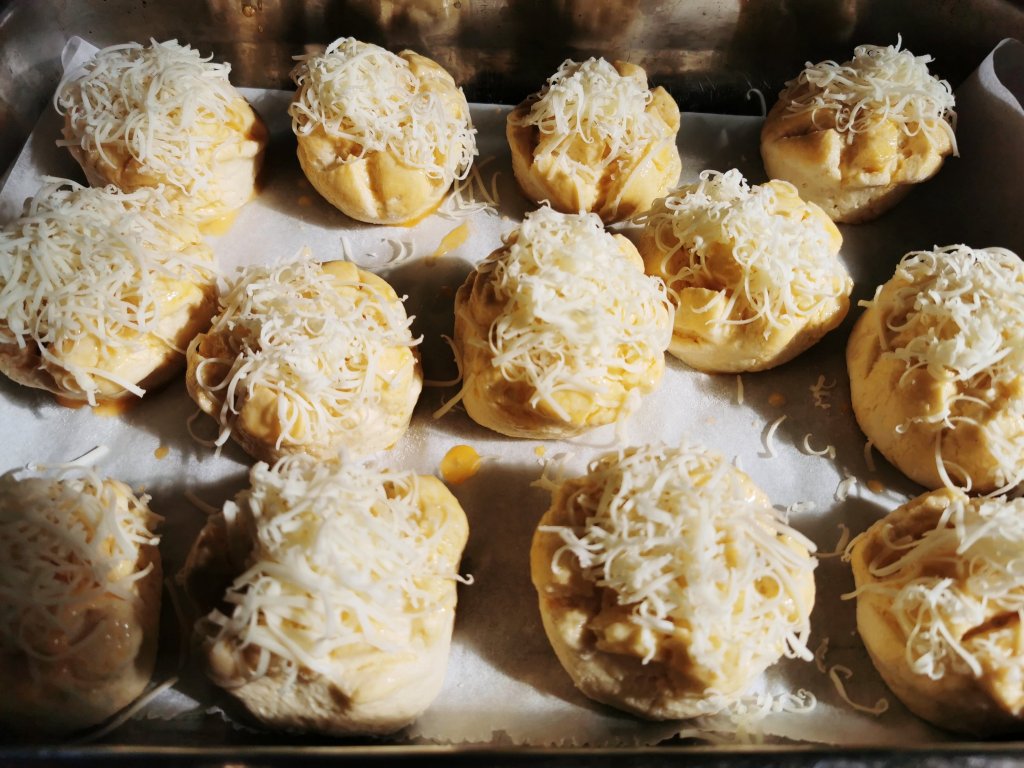 ●Éles késsel rácsozzuk be a tetejüket, kenjük le felvert tojással és szórjuk meg reszelt sajttal.
