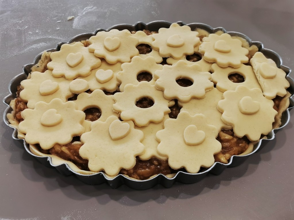 - A másik adag tésztával díszítsük ízlés szerinti formákkal szaggatva a pite tetejét.