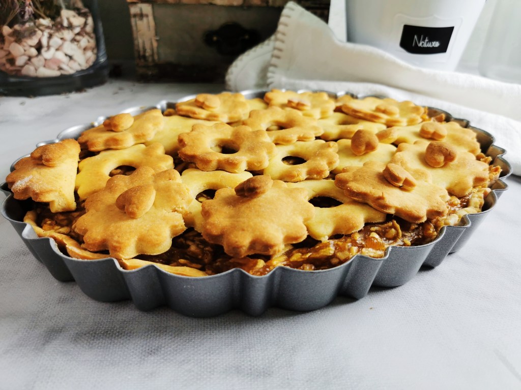 A tésztába is viszek egy kis csavart és tulajdonképpen az egyszerű linzer alap helyett egy bejgli tészta közé zárom az almás krémet.