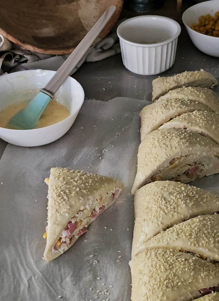 Vágjuk a tekercset háromszögekre, szórjuk meg a tetejét ízlés szerint szezámmaggal és tegyük sütőpapírral bélelt tepsibe.