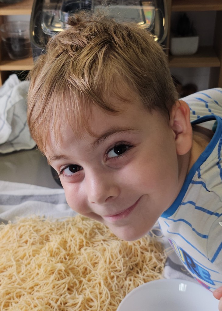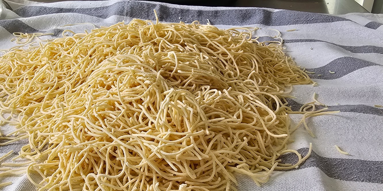 250 g lisztkeverékből elég nagy mennyiségű tésztát lehet készíteni. Amit nem főzök ki frissen, azt meg szoktam szárítani. Ehhez a tésztát megszórom kevés rizsliszttel és jól szétterítem egy tiszta konyharuhán. Én alá szoktam tenni egy rácsot, így még gyorsabban szárad meg. Ha kellemes idő van kint, akkor kiteszem a teraszra és pár óra múlva mehet a papírdobozba. Ha tényleg rendesen ki van szárítva, akkor papírdobozban nagyon sokáig eláll.