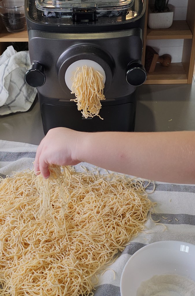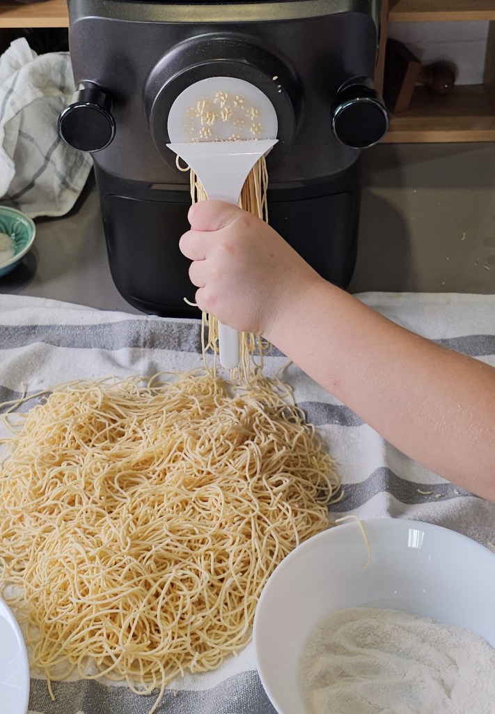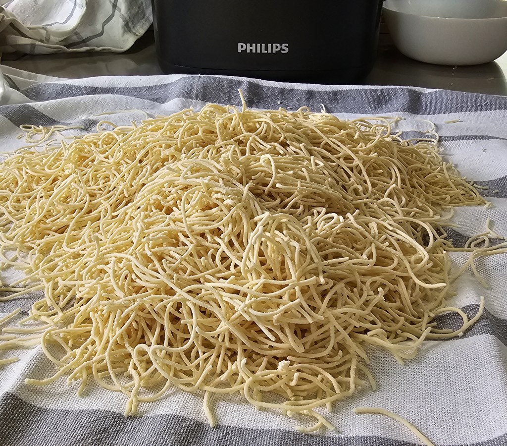 Miután a gép befejezte a tészta keverését, elkezdi tömöríteni, kitolni. Mikor megjelennek az első tészta foszlányok, akkor kell egy kevés idő, hogy minden lyukacskából a tökéletes tészta bukkanjon elő. Én ezeket felfogom és a folyamat vége felé visszateszem a gépbe. A gép bármikor leállítható menet közben, majd újra el lehet indítani. Hogy minél kevesebb tészta tapadjon bent a gépben, én bele szoktam turkálni kicsit, amikor visszapakolom a selejt tésztáka. Így nagyon minimális tésztából nem lesz tészta.