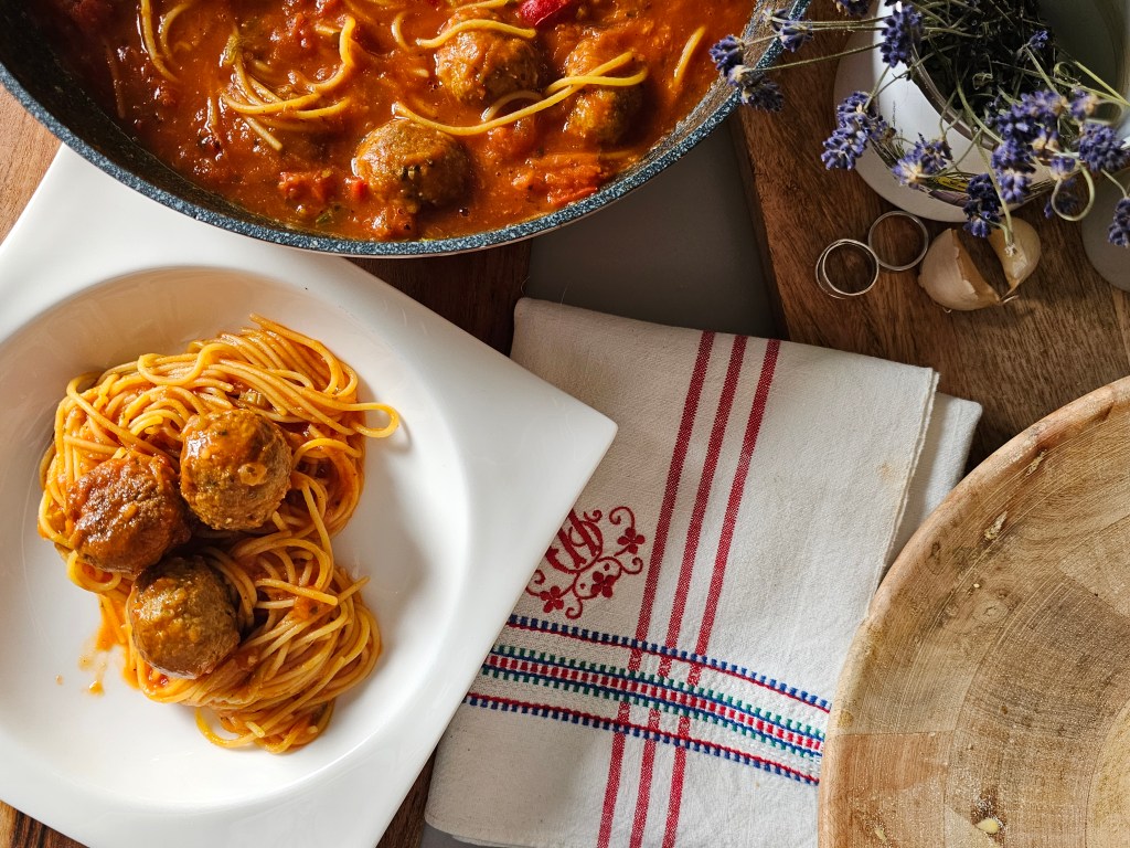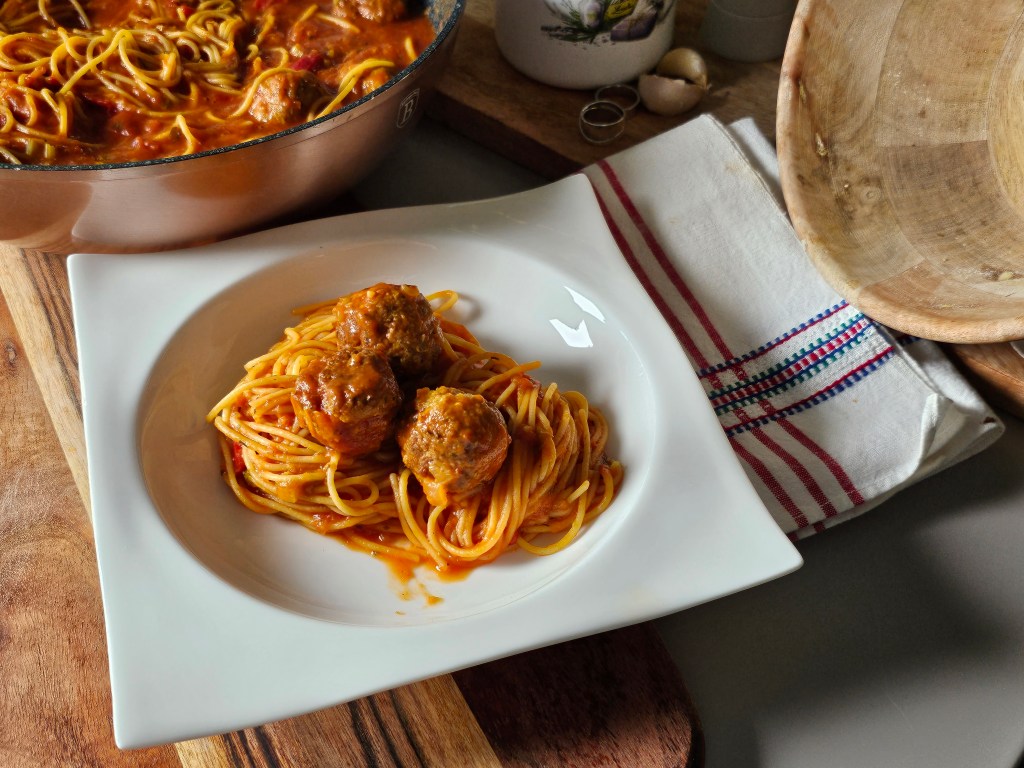 Míg én itt csacsogok nektek, közben a videón egy eszméletlen finom, glutén- és tejmentes paradicsomos tésztát láthattok némi húsgombóc társaságában. Ez az én kamaszom másik kedvence a tortilla mellett. Az egész étel lelke a jó minőségű, gluténmentes spagetti tészta. Ehhez a kifli.hu-ról vásároltam pasta doro tésztát, aminek az árát befagyasztották az év végéig, így 500 g tészta 679 Ft-ba kerül. Ha már a tésztánál tartok, akkor gyorsan elmesélem, hogy ehhez az ételhez szigorúan al dente főzöm meg vízben, vagyis akkor nyilvánítom késznek, mikor rendesen rá kell harapni ahhoz, hogy a végeredmény tökéletes legyen, ugyanis a végleges állagát a paradicsomos szószban rotyogtatva éri el. És nem, nem szűröm a tésztát a mosogatóba, mert a szószt a tészta főzővizével állítom be.