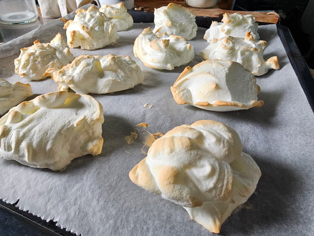 - Egy nagyméretű tepsit béleljünk ki sütőpapírral és két kanál segítségével halmozzuk rá a habot.