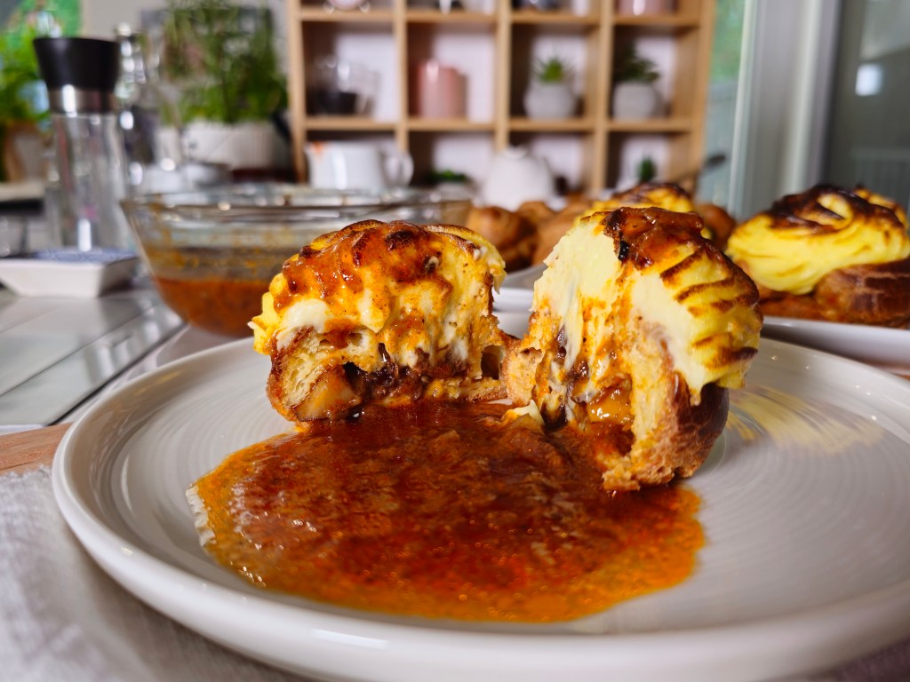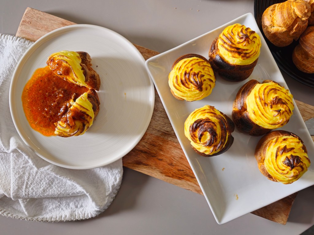 - Töltsük meg a fánkokat raguval. Kevesebb szaftot tegyünk bele, hogy ne áztassa el a tésztát. Ezek után a habzsákból nyomjunk rá körkörös mozdulatokkal pürékupolákat.
