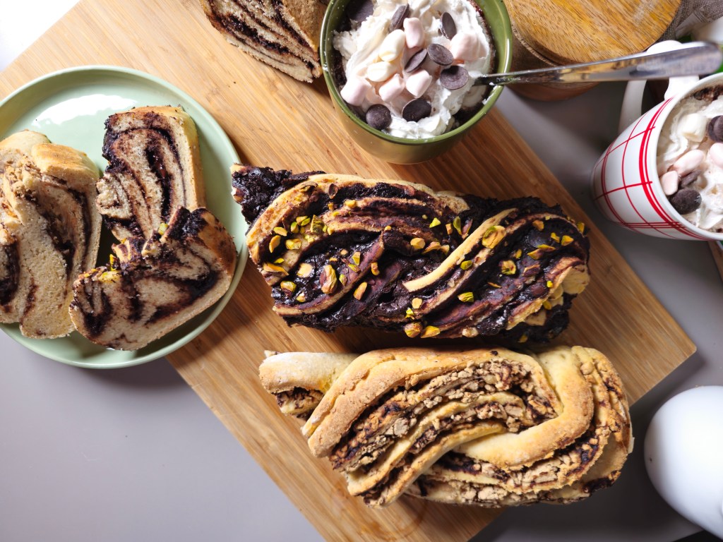 - Mindkettőt tegyük a sütőpapírral együtt kenyérsütő formába, a csokis tetejét szórjuk meg rusztikusra darabolt pisztáciával.