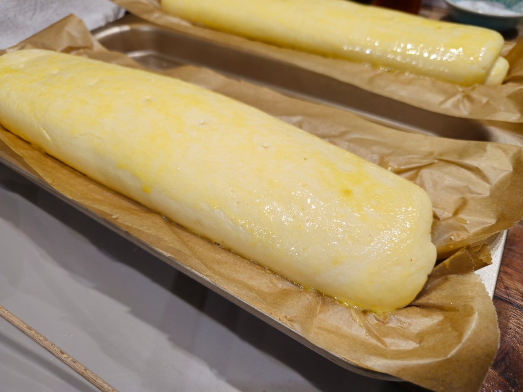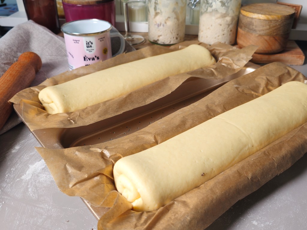 - Tegyük a feltekert rudat sütőpapírral bélelt tepsibe vagy bagett sütő formába.