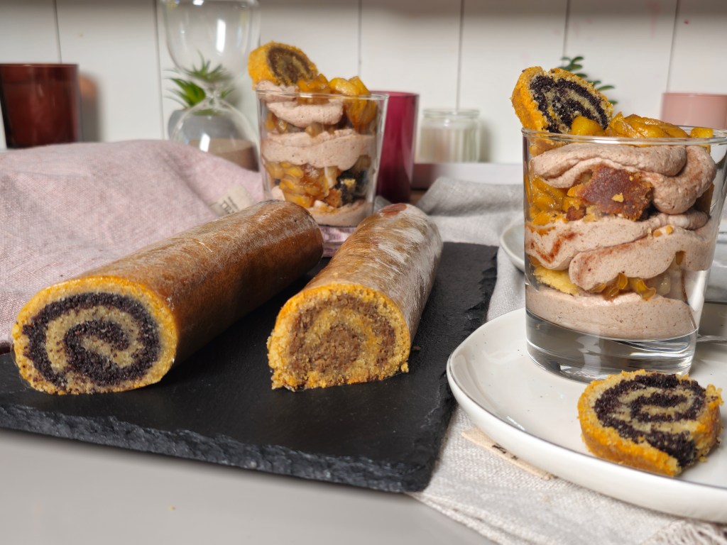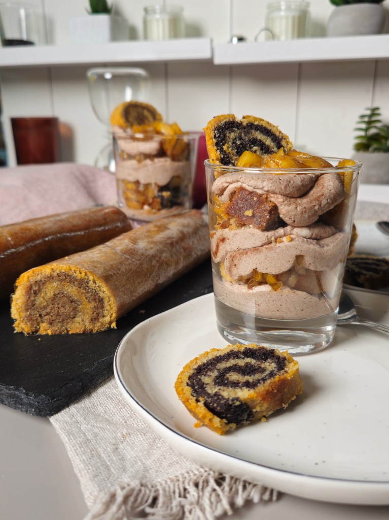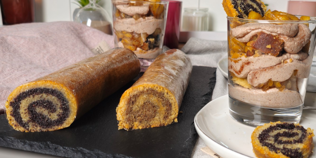 - A pohár aljára nyomjunk habzsákból krémet, erre kerüljön a darabokra tördelt mákos tekercs, alma. Majd jöhet rá egy újabb adag krém, a diós tekercs, alma és végül a krém maradéka.