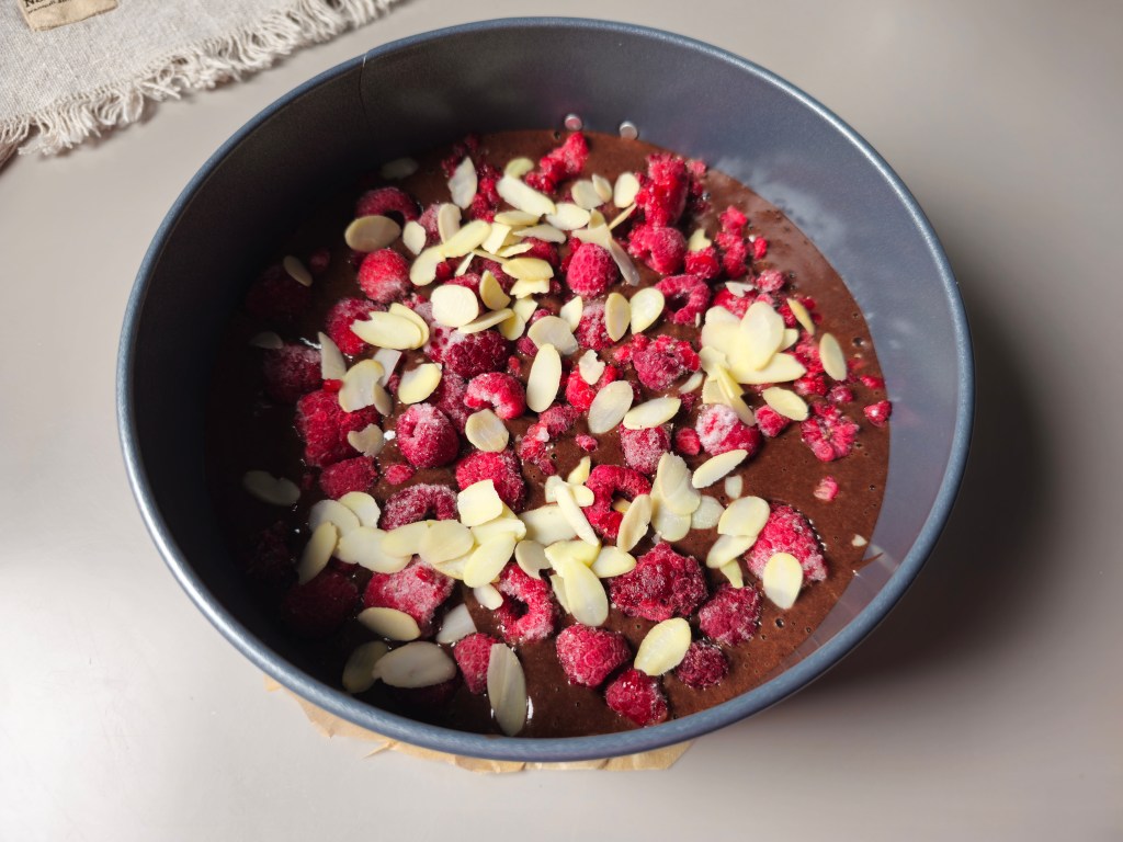 - Öntsük a masszát egy 18 cm átmérőjű, sütőpapírral bélelt tortaformába, szórjuk meg gazdagon málnával, szeletelt mandulával.