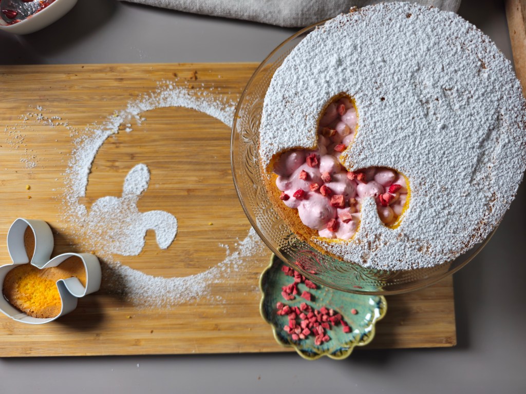 - A kihűlt piskóta 1/3 részénél vágjuk el a piskótát. Az vékonyabb darabot szúrjuk ki egy nyuszis kiszúróval és gazdagon hintsük meg porcukorral.