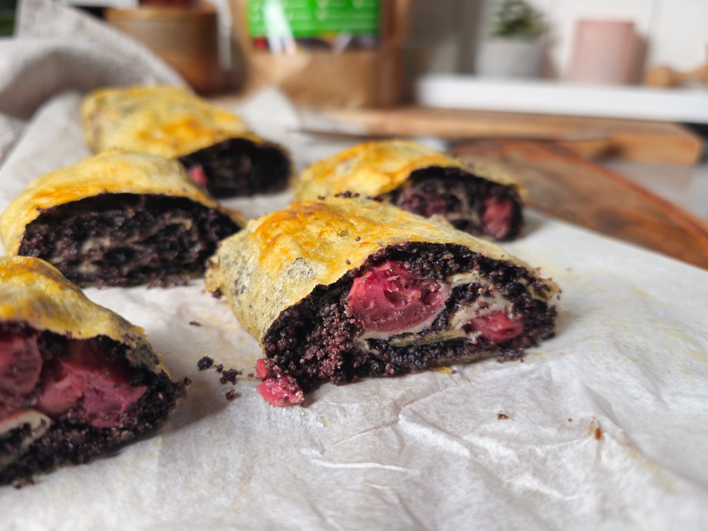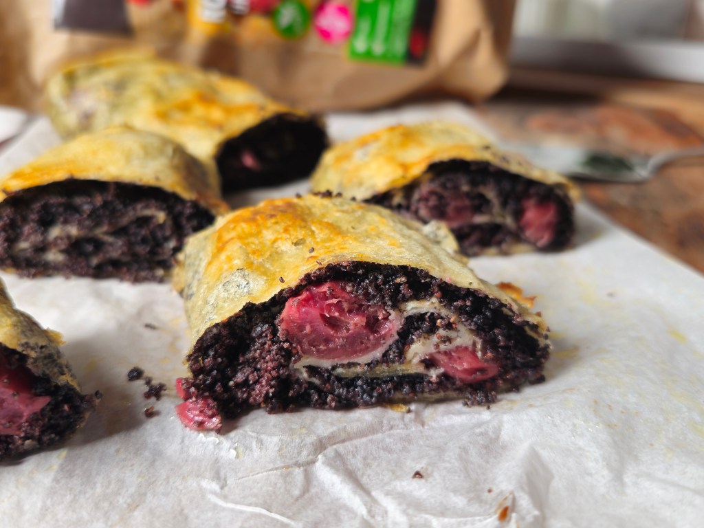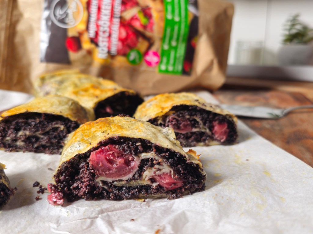 - A töltelékhez a mákot, az édesítőt keverjük össze az olvasztott margarinnal és oszlassuk el a lapok tetején. Szórjuk meg meggyel.