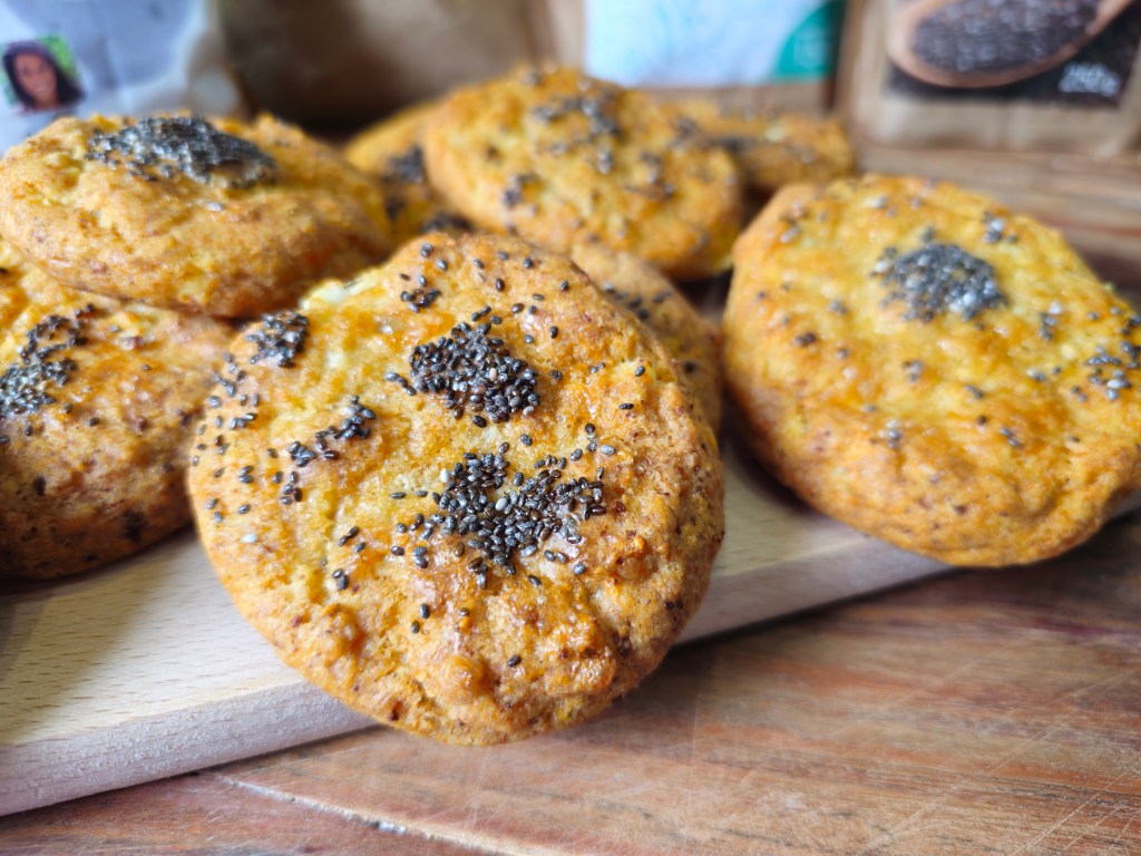 - A tojáshelyettesítő mázat keverjük csomómentesre a vízzel és kenjük le a pogácsák tetejét. Szórjuk meg chia maggal és tegyük a 180 fokra előmelegített sütőbe.
