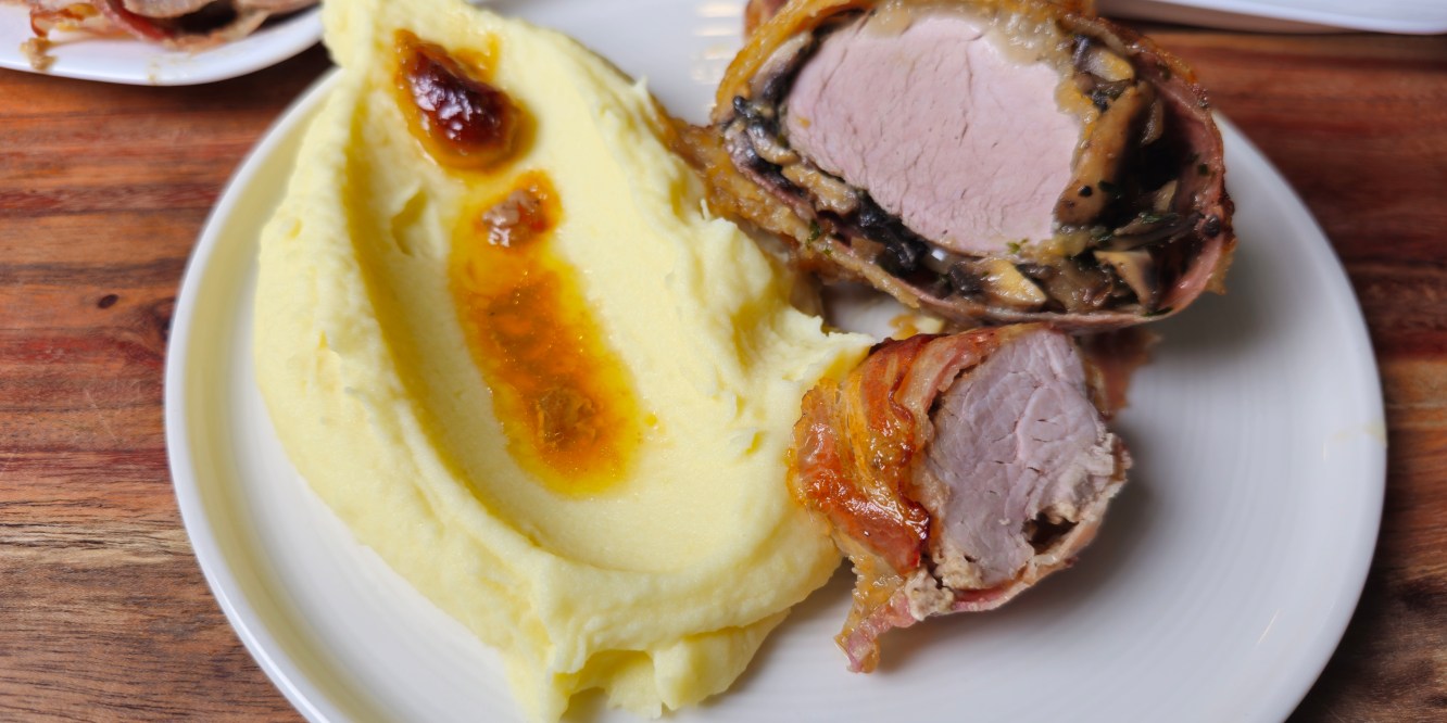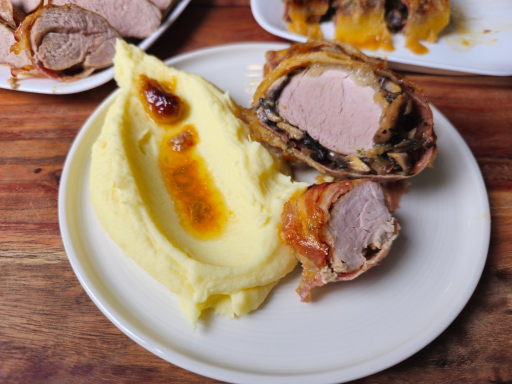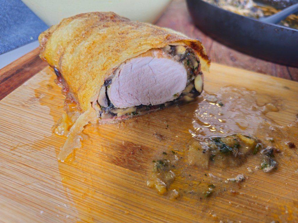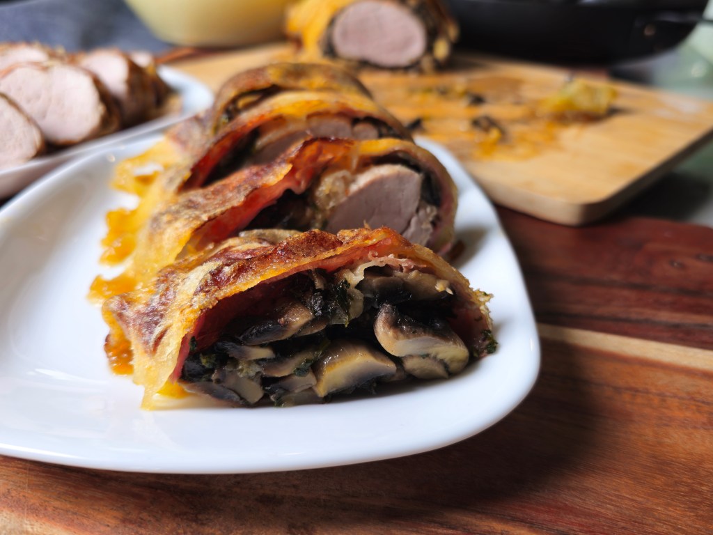 Régen, mikor még mindent ehettem, nagyon szerettem a Wellington szeletet. Mióta gluténmentesen sütök és főzök, többféle módon próbáltam prezentálni ezt. Sütöttem kész, gluténmentes leveles tésztából, saját vajas, gyúrt és leveles jellegű tésztával. Most pedig eszembe jutott, hogy mi lenne, ha a réteshez használt, piszok egyszerű tészta lenne az egész történet csavarja. Szóval belevágtam. A kifli.hu-ról rendeltem a napokban szűzpecsenyét, amit minden flanc nélkül baconba csavarva gondoltam megsütni. Az egyik darab hús így is végezte, a másikat pedig feláldoztam a kísérletezés oltárán. És milyen jól tettem, mert zseniálisan jó lett. Nyilván nem mondhatom rá, hogy olyan, mint az eredeti, hiszen szinte minden eleme eltér attól, de ennek ellenére nagyon finom és nem egy nagy ördöngösség az elkészítése. A lapocskák sütéséről már számtalan videót, receptet osztottam meg és töltöttem édesen sokfajta töltelékkel. A megsült lappokat sütőpapírra készítettem elő és fektettem rá fekete erdei sonkát, így a szaftos gomba nem áztatta el a hajszálvékony lapokat. A húst alaposan körbe sütögettem, hogy kapjon egy csodás kérget. A gombát hagymával pirítottam össze és jó sok petrezselyemmel fűszereztem. Ez került a sonka tetejére. Az elősütött húst vékonyan mustárral kentem körbe, majd a gombára helyeztem és egyszerűen feltekertem a sütőpapír segítségével. A bundás tekercs mellé került egy baconba csavart tekercs így. Így sütöttem készre őket a sütőben. Egy nagyon egyszerű, krémes burgonyapürét kavartam mellé.