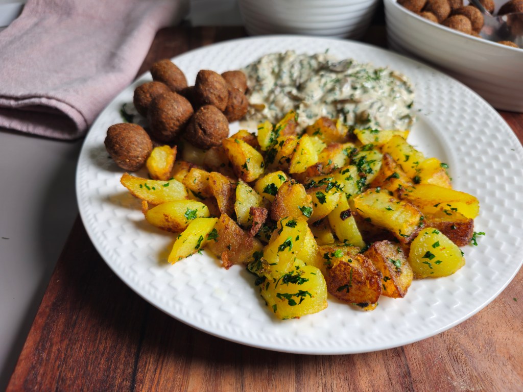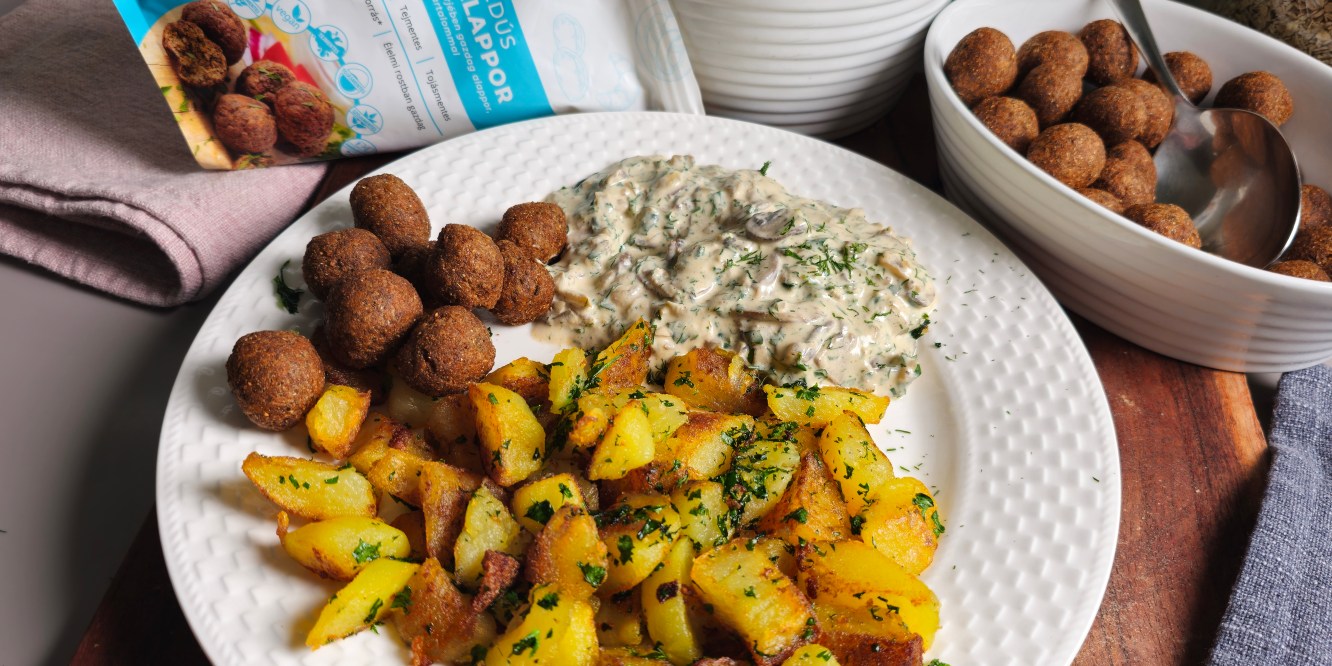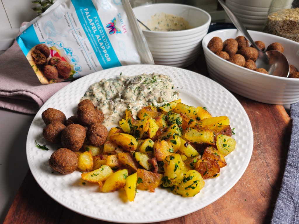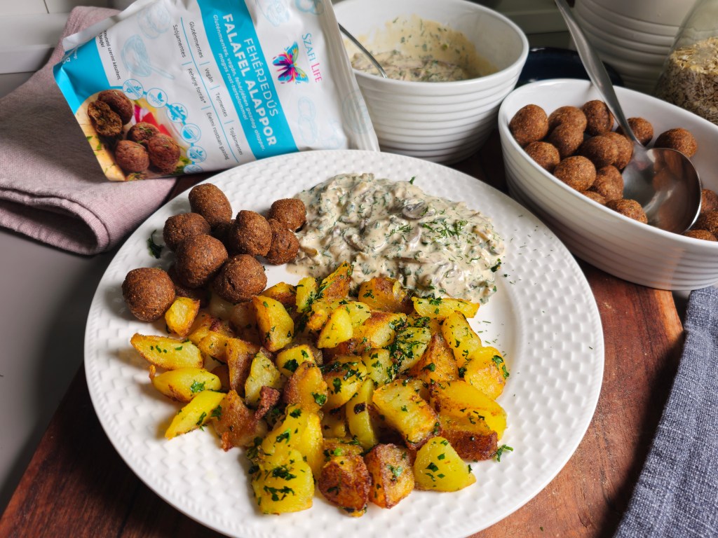 - Tálaljuk a burgonyát a gombamártással és az apró falafel golyókkal.