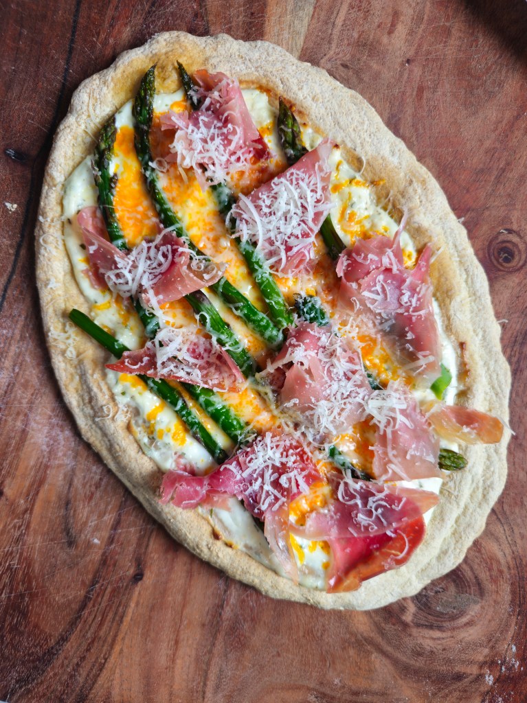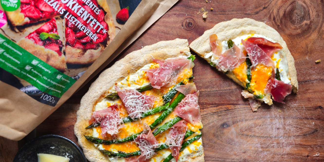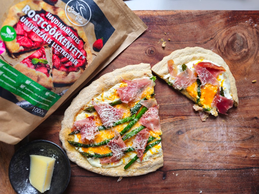 Hetek óta nem ettem pizzát, hetek óta sóvárgok utána, így ma arra az elhatározásra jutottam, hogy lesz, ami lesz, pizzát eszem ebédre. Ha pedig pizza, magamnak, magam miatt, akkor legyen maximálisan olyan, ahogy én kívánom. Pikkpakk összeállítottam egy tésztát Szafi Free hajdinamentes rostcsökkentett univerzális lisztkeverékkel Tögyi Julika receptje alapján. Julika receptjeiben még soha nem csalódtam, szóval, ha szeretitek a Szafis termékeket, keressétek és használjátok nyugodtan a receptjeit. A tésztát pihentettem pár percet, közben előkészítettem a feltétnek szánt spárgát. Letörtem a fás részét és enyhén citromos, sós vízben előpároltam.