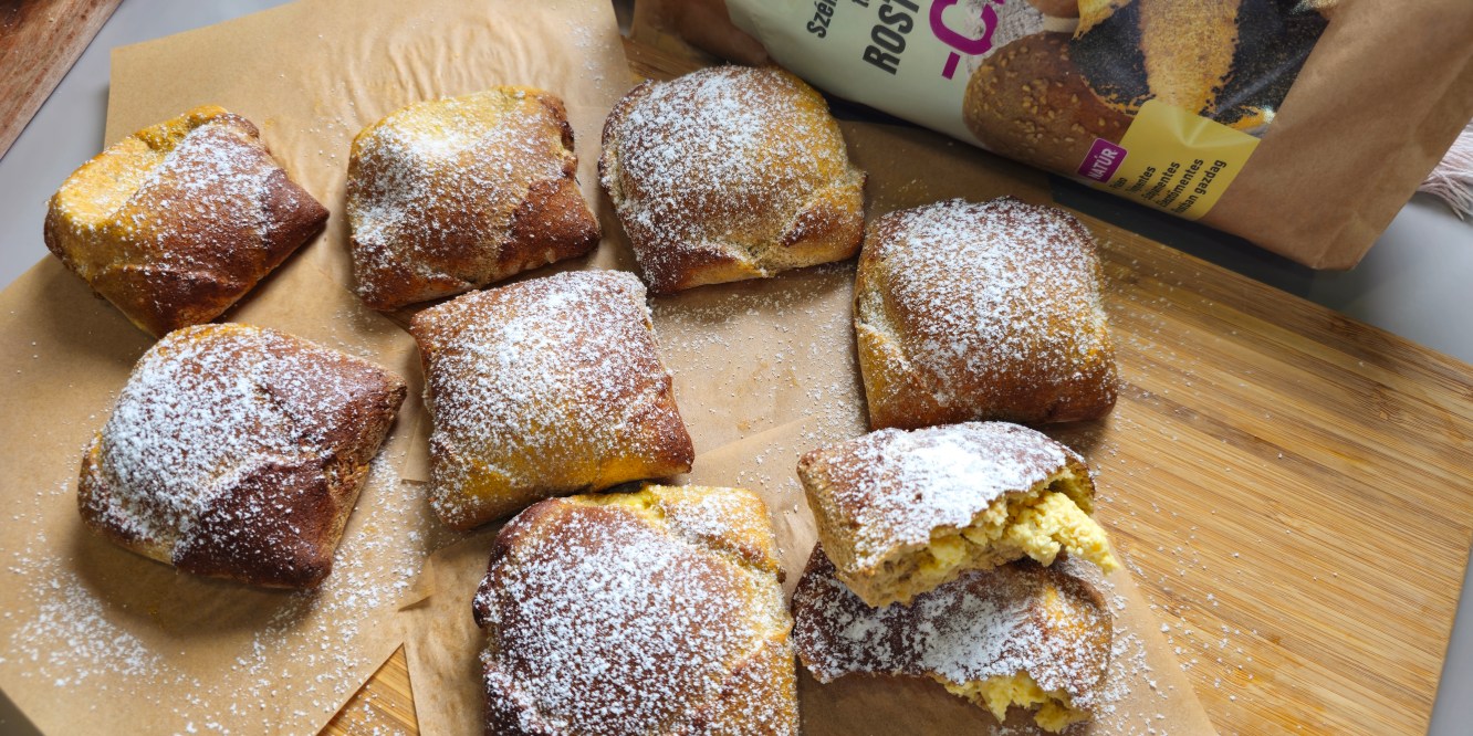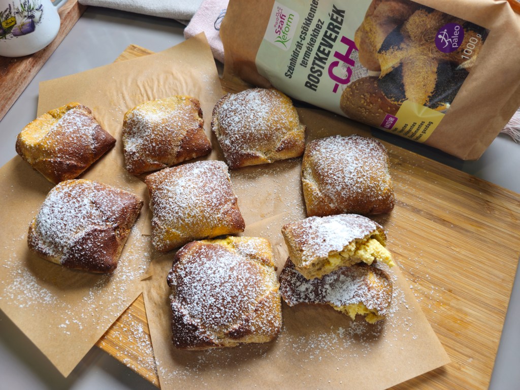 Holnap lesz 4 hete, hogy egy elég kemény diétába vágtam. Az elsődleges cél nem a fogyás, persze nem bánom, hogy a kilók is szépen olvadoznak lefelé, hanem egyéb egészségügyi okai vannak. A 4 hét alatt csupa pozitív változáson mentem át. Időnként természetesen megkívánom az édességet, de szerencsére a pozitív változások miatt könnyen teszem túl magam a cukor iránti vágyon. Múlt hétvégén döntöttem el, hogy heti egyszer megjutalmazom magam és készítek valami olyan desszert szerűt, amit simán megehetek. És tudjátok, ami egyszer jól bevált, azon nem változtatnunk. Így a múlt heti igen alacsony szénhidráttartalmú kakaós csiga receptem tésztájából készült ma túrós batyu, sovány túróból. A tésztához a Szafi Reform szénhidrát-csökkentett termékekhez rostkeveréket és bambuszrost lisztet használtam. 100 g rostkeverék szénhidrát tartalma 1,1 g, a bambuszrost lisztnek pedig 0,5 g. Szóval ez olyannyira elenyésző, hogy számolni sem érdemes vele. A receptben megadott mennyiségből 8 db batyut formáztam. Én olyan jóízűen faltam, mint aki napok óta egy falat kajához sem jutott. Az ég világon nincs semmilyen mellékíze és itt most nem az éhség beszél belőlem.