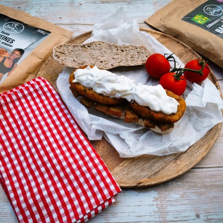 Vegán fasírtos, „szalonnás” szendvics tzatziki salátával