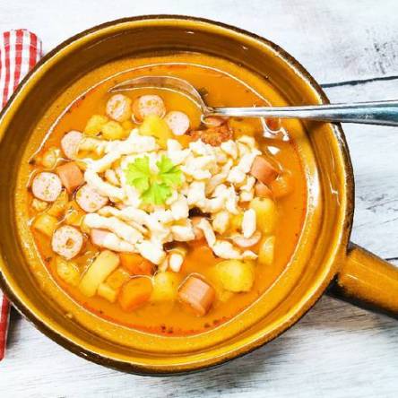 Krumplileves tárkonyosan füstölt virslivel gluténmentesen
